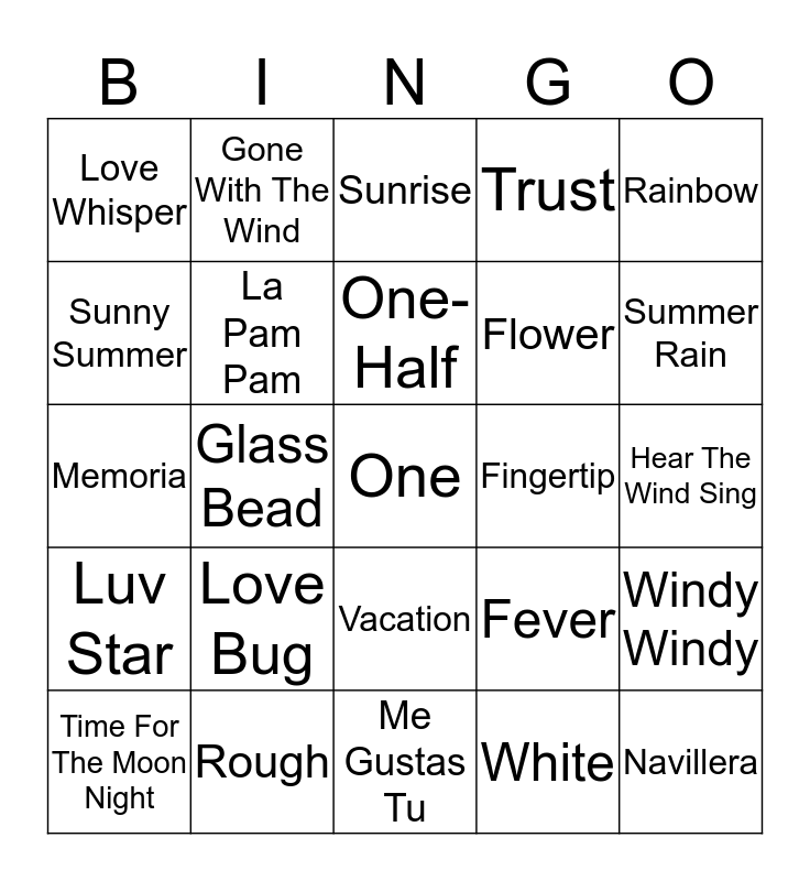 This bingo card has 25 words: Love Bug, Me Gustas Tu, One-Half, Time For The Moon Night, Rainbow, Love Whisper, Sunny Summer, Gone With The Wind, Fingertip, Vacation, Flower, Memoria, Fever, Windy Windy, La Pam Pam, Navillera, Hear The Wind Sing, Sunrise, Summer Rain, Glass Bead, One, Rough, Luv Star, Trust and White.