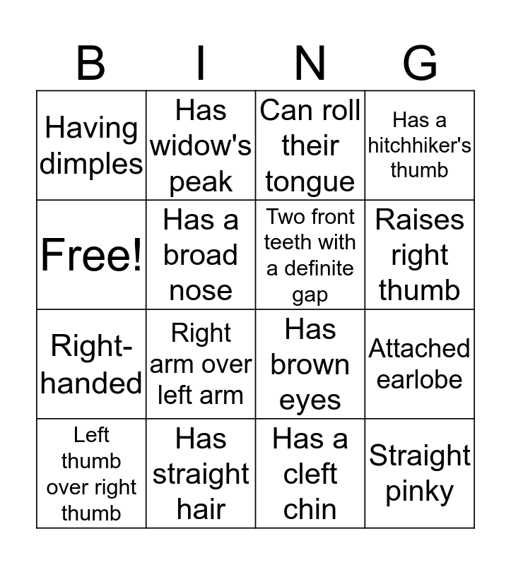 This bingo card has 16 words: Has straight hair, Attached earlobe, Can roll their tongue, Having dimples, Right-handed, Has widow's peak, Has brown eyes, Has a cleft chin, Free!, Has a broad nose, Left thumb over right thumb, Has a hitchhiker's thumb, Right arm over left arm, Raises right thumb, Two front teeth with a definite gap and Straight pinky.