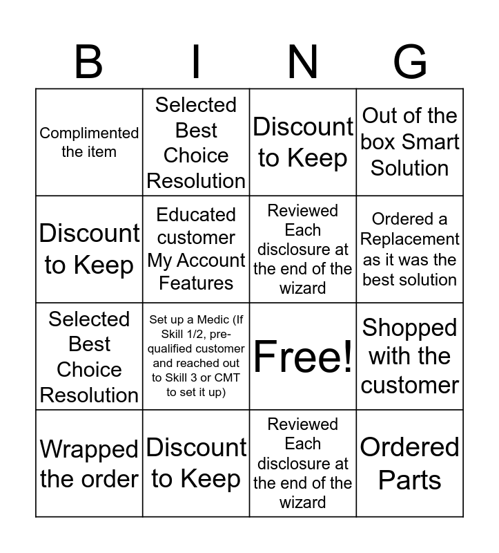 This bingo card has 22 words: Discount to Keep, Ordered Parts, Selected Best Choice Resolution, Used the margins to offer DTK, Educated customer My Account Features, Reviewed Each disclosure at the end of the wizard, Complimented the item, Discount to Keep, Free!, Ordered Parts, Selected Best Choice Resolution, Out of the box Smart Solution, Used the margins to offer DTK, Educated customer My Account Features, Reviewed Each disclosure at the end of the wizard, Verified the Account Properly, Shopped with the customer, Wrapped the order, Set up a Medic (If Skill 1/2, pre-qualified customer and reached out to Skill 3 or CMT to set it up), Discount to Keep, Ordered a Replacement as it was the best solution and Made the customer laugh.