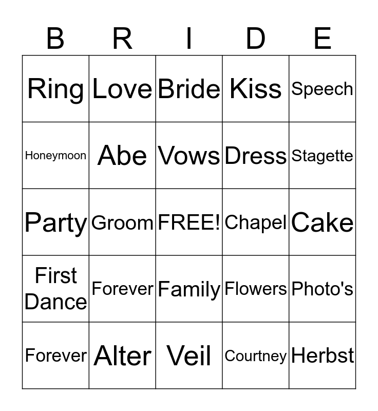 This bingo card has a free space and 24 words: Forever, Alter, Vows, Forever, Speech, Ring, Honeymoon, Love, Chapel, Family, Dress, Party, Flowers, Photo's, Abe, Courtney, Cake, Bride, Stagette, Groom, Herbst, First Dance, Kiss and Veil.