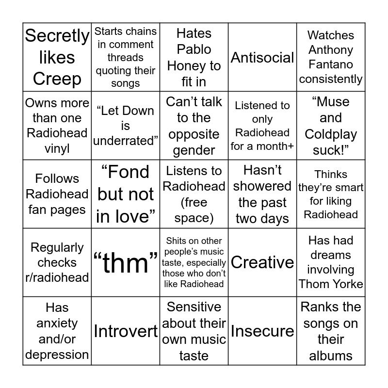 This bingo card has a free space and 24 words: “thm”, Introvert, Can’t talk to the opposite gender, Has anxiety and/or depression, Watches Anthony Fantano consistently, Secretly likes Creep, Owns more than one Radiohead vinyl, Starts chains in comment threads quoting their songs, Hasn’t showered the past two days, Shits on other people’s music taste, especially those who don’t like Radiohead, Listened to only Radiohead for a month+, Follows Radiohead fan pages, Creative, Has had dreams involving Thom Yorke, “Let Down is underrated”, Insecure, Thinks they’re smart for liking Radiohead, Hates Pablo Honey to fit in, “Muse and Coldplay suck!”, “Fond but not in love”, Ranks the songs on their albums, Regularly checks r/radiohead, Antisocial and Sensitive about their own music taste.