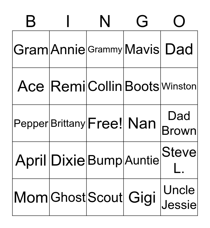 This bingo card has a free space and 24 words: Dixie, Ghost, Collin, Mom, Dad, Gram, Ace, Annie, Nan, Bump, Boots, Pepper, Auntie, Steve L., Remi, Gigi, Dad Brown, Grammy, Winston, Brittany, Uncle Jessie, April, Mavis and Scout.