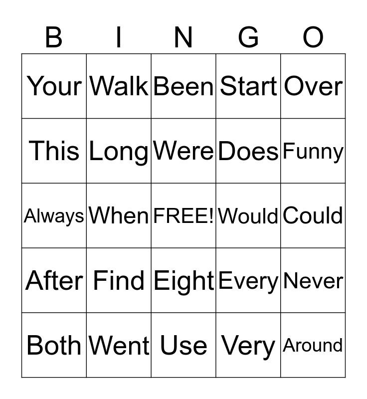 This bingo card has a free space and 24 words: Find, Went, Were, Both, Over, Your, This, Walk, Would, Eight, Does, Always, Every, Never, Long, Very, Could, Been, Funny, When, Around, After, Start and Use.