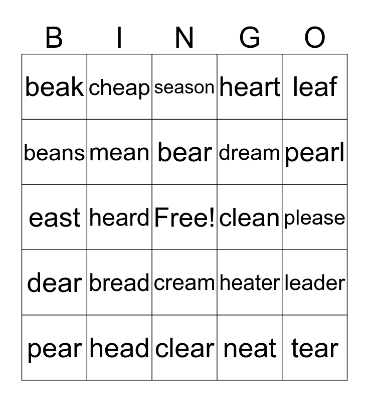 This bingo card has a free space and 24 words: bread, head, bear, pear, leaf, beak, beans, cheap, clean, cream, dream, east, heater, leader, mean, neat, please, season, pearl, heard, tear, dear, heart and clear.