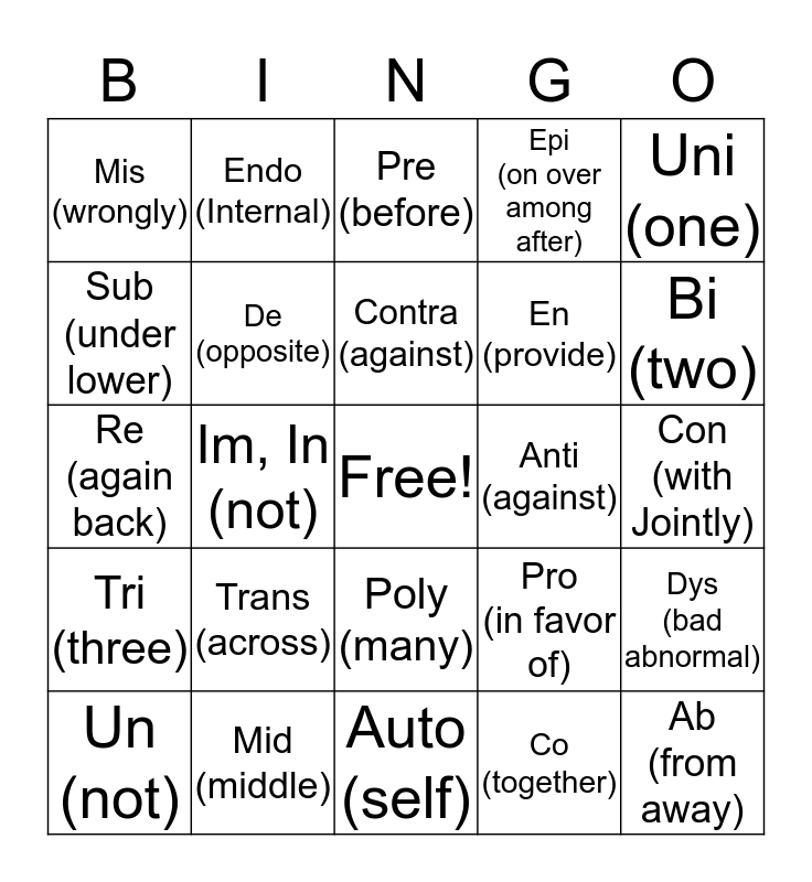 This bingo card has a free space and 29 words: Un (not), Re (again), Im, In (not), Dis (opposite), Mis (wrongly), Pre (before), De (opposite), Trans (across), Anti (against), Mid (middle), Con (with Jointly), Ab (from away), Auto (self), Co (together), Bi (two), Ad (to toward), Poly (many), Tri (three), Uni (one), Re (again back), Pro (in favor of), Counter (opposite), En (provide), Sub (under lower), Epi (on over among after), Endo (Internal), Dys (bad abnormal), Contra (against) and Deca (ten).