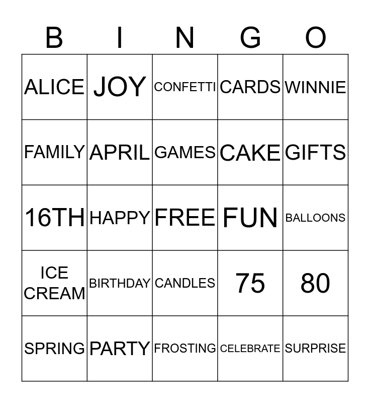 This bingo card has a free space and 24 words: BIRTHDAY, PARTY, GAMES, SPRING, WINNIE, ALICE, FAMILY, JOY, FUN, CANDLES, CAKE, 16TH, 75, 80, APRIL, CELEBRATE, BALLOONS, CONFETTI, GIFTS, HAPPY, SURPRISE, ICE CREAM, CARDS and FROSTING.