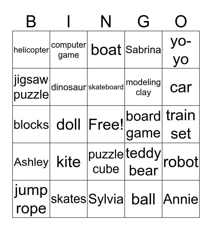 This bingo card has a free space and 24 words: kite, skates, skateboard, jump rope, yo-yo, helicopter, jigsaw puzzle, computer game, board game, puzzle cube, modeling clay, blocks, teddy bear, robot, dinosaur, ball, train set, boat, car, doll, Annie, Ashley, Sabrina and Sylvia.