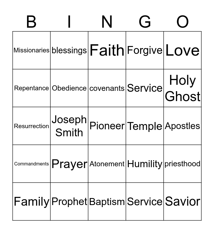 This bingo card has a free space and 29 words: Family, scriptures, Joseph Smith, Eternal, Missionaries, Faith, Obedience, Prayer, Temple, Prophet, Apostles, Savior, Baptism, Service, Holy Ghost, Book of Mormon, Atonement, Commandments, Love, Resurrection, Humility, Motherhood, Service, Repentance, Forgive, blessings, priesthood, covenants and Redeemer.