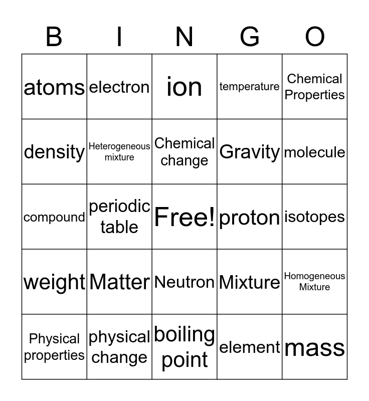 This bingo card has a free space and 24 words: Matter, physical change, Chemical change, Physical properties, Chemical Properties, atoms, density, electron, proton, Neutron, Gravity, compound, Mixture, Homogeneous Mixture, Heterogeneous mixture, element, isotopes, ion, molecule, periodic table, mass, weight, temperature and boiling point.