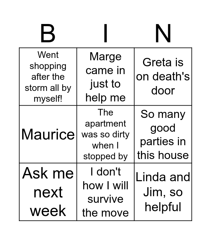 This bingo card has 10 words: Ask me next week, Marge came in just to help me, Greta is on death's door, Maurice, The apartment was so dirty when I stopped by, Linda and Jim, so helpful, Went shopping after the storm all by myself!, I don't how I will survive the move, So many good parties in this house and Turnip puff because I like it.