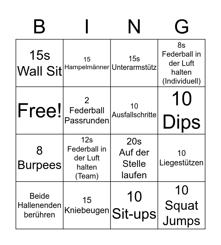 This bingo card has 16 words: 15 Kniebeugen, 10 Liegestützen, 15s Unterarmstütz, 15s Wall Sit, 8 Burpees, 15 Hampelmänner, 20s Auf der Stelle laufen, 10 Sit-ups, Free!, 2 Federball Passrunden, Beide Hallenenden berühren, 8s Federball in der Luft halten (Individuell), 12s Federball in der Luft halten (Team), 10 Dips, 10 Ausfallschritte and 10 Squat Jumps.