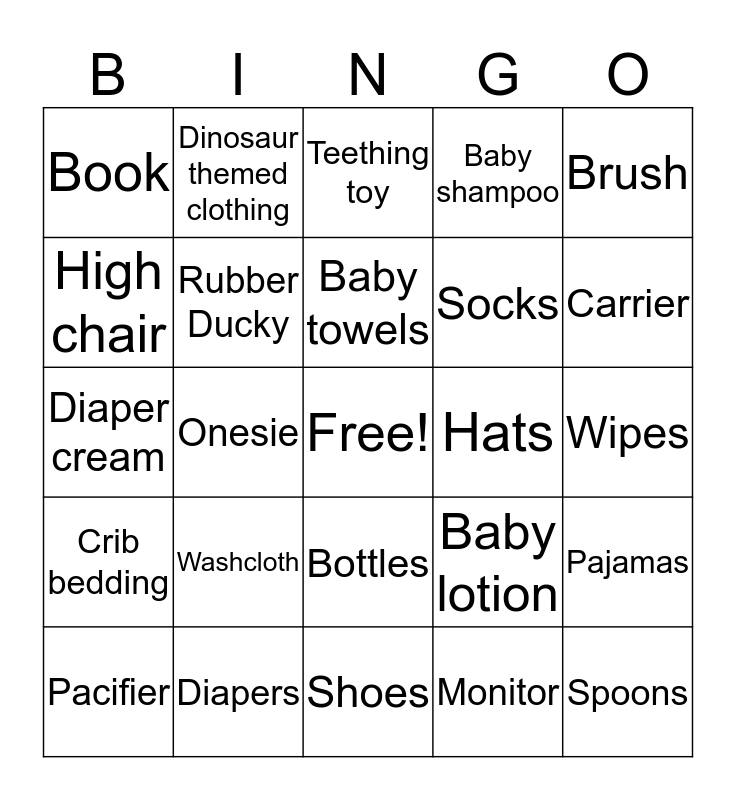 This bingo card has a free space and 29 words: Pacifier, Blanket, Onesie, Outfit, Book, Teething toy, Rubber Ducky, Washcloth, Hats, Diapers, Wipes, Spoons, Shoes, Monitor, Carrier, Gift card, Bottles, Crib bedding, Brush, Diaper cream, Baby lotion, Bibs, Socks, High chair, Baby shampoo, Dinosaur themed clothing, Pajamas, Baby towels and Diaper genie.