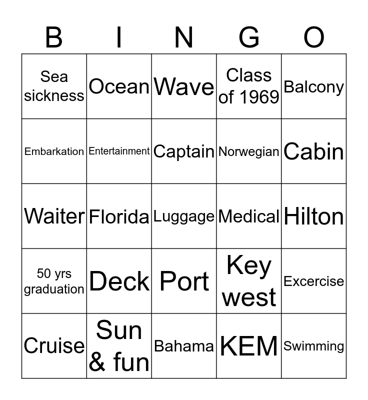 This bingo card has 26 words: Port, KEM, Captain, Sun & fun, Balcony, Sea sickness, Embarkation, Ocean, Hilton, Key west, Norwegian, Waiter, Excercise, Cruise, Florida, Reunion, Class of 1969, 50 yrs graduation, Wave, Luggage, Cabin, Bahama, Medical, Deck, Entertainment and Swimming.