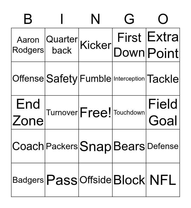This bingo card has a free space and 24 words: Packers, Pass, Fumble, Badgers, Extra Point, Aaron Rodgers, Offense, Quarter back, Touchdown, Snap, Interception, End Zone, Bears, Defense, Safety, Block, Field Goal, Kicker, Tackle, Turnover, NFL, Coach, First Down and Offside.