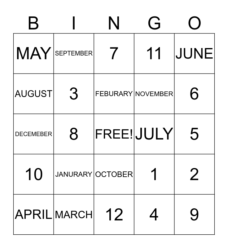 This bingo card has a free space and 24 words: JANURARY, MARCH, FEBURARY, APRIL, JUNE, MAY, AUGUST, SEPTEMBER, JULY, OCTOBER, NOVEMBER, DECEMEBER, 1, 2, 3, 4, 5, 7, 6, 8, 9, 10, 11 and 12.