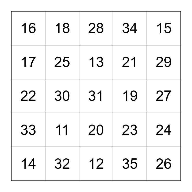 This bingo card has 25 words: 11, 12, 13, 14, 15, 16, 17, 18, 19, 20, 21, 22, 23, 24, 25, 26, 27, 28, 29, 30, 31, 32, 33, 34 and 35.