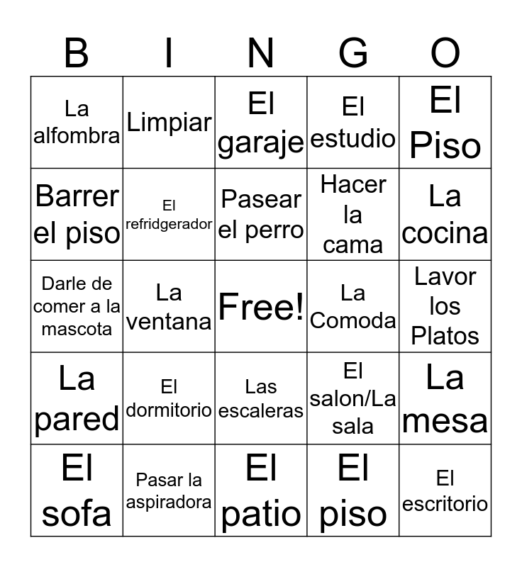 This bingo card has a free space and 24 words: El dormitorio, Pasar la aspiradora, Pasear el perro, El sofa, El Piso, La alfombra, Barrer el piso, Limpiar, La Comoda, Las escaleras, Hacer la cama, Darle de comer a la mascota, El salon/La sala, La mesa, El refridgerador, El piso, Lavor los Platos, El garaje, La cocina, La ventana, El escritorio, La pared, El estudio and El patio.