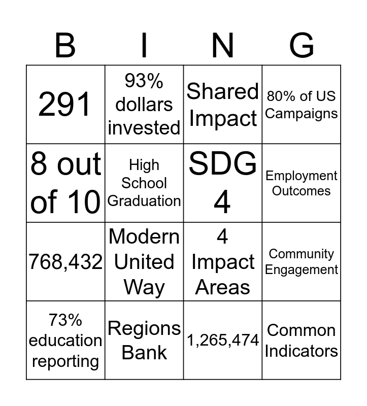 This bingo card has 18 words: Modern United Way, Common Indicators, Shared Impact, 291, 4 Impact Areas, 80% of US Campaigns, 73% education reporting, 93% dollars invested, Employment Outcomes, 768,432, 1,265,474, 8 out of 10, Community Engagement, High School Graduation, SDG 4, 59 GCLs, Regions Bank and SPC Content.