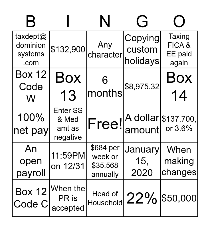 This bingo card has a free space and 24 words: 11:59PM on 12/31, When the PR is accepted, 6 months, Box 12 Code C, Taxing FICA & EE paid again, taxdept@ dominion systems .com, Box 12 Code W, $132,900, A dollar amount, $684 per week or $35,568 annually, $8,975.32, 100% net pay, January 15, 2020, When making changes, Box 13, 22%, $137,700, or 3.6%, Any character, Box 14, Enter SS & Med amt as negative, $50,000, An open payroll, Copying custom holidays and Head of Household.