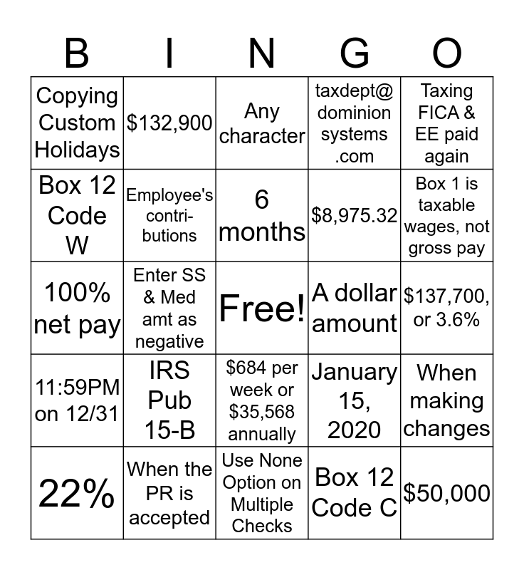 This bingo card has a free space and 24 words: IRS Pub 15-B, When the PR is accepted, 6 months, 22%, Taxing FICA & EE paid again, Copying Custom Holidays, Box 12 Code W, $132,900, A dollar amount, $684 per week or $35,568 annually, $8,975.32, 100% net pay, January 15, 2020, When making changes, Employee's contri-butions, Box 12 Code C, $137,700, or 3.6%, Any character, Box 1 is taxable wages, not gross pay, Enter SS & Med amt as negative, $50,000, 11:59PM on 12/31, taxdept@ dominion systems .com and Use None Option on Multiple Checks.