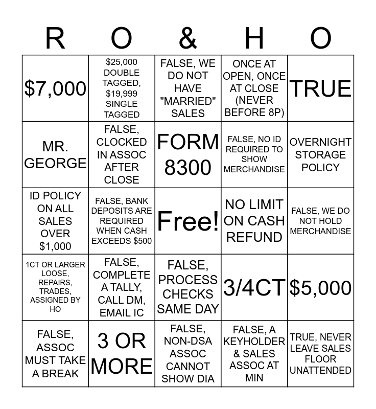 This bingo card has a free space and 24 words: FALSE, COMPLETE A TALLY, CALL DM, EMAIL IC, 3 OR MORE, FORM 8300, FALSE, ASSOC MUST TAKE A BREAK, TRUE, $7,000, MR. GEORGE, $25,000 DOUBLE TAGGED, $19,999 SINGLE TAGGED, NO LIMIT ON CASH REFUND, FALSE, PROCESS CHECKS SAME DAY, FALSE, NO ID REQUIRED TO SHOW MERCHANDISE, ID POLICY ON ALL SALES OVER $1,000, 3/4CT, $5,000, FALSE, CLOCKED IN ASSOC AFTER CLOSE, FALSE, A KEYHOLDER & SALES ASSOC AT MIN, FALSE, WE DO NOT HOLD MERCHANDISE, FALSE, WE DO NOT HAVE "MARRIED" SALES, OVERNIGHT STORAGE POLICY, FALSE, BANK DEPOSITS ARE REQUIRED WHEN CASH EXCEEDS $500, TRUE, NEVER LEAVE SALES FLOOR UNATTENDED, 1CT OR LARGER LOOSE, REPAIRS, TRADES, ASSIGNED BY HO, ONCE AT OPEN, ONCE AT CLOSE (NEVER BEFORE 8P) and FALSE, NON-DSA ASSOC CANNOT SHOW DIA.