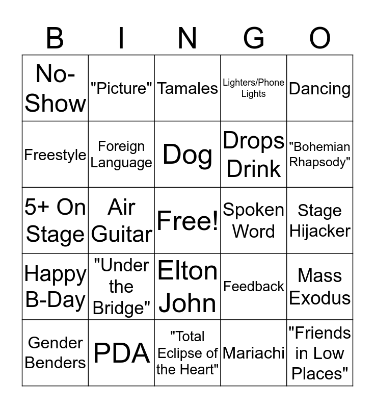 This bingo card has a free space and 43 words: "Sweet Caroline", "Friends in Low Places", Madonna, Gender Benders, Showtunes, Mariachi, Tamales, Wannabe Lounge Singer, Dancing, PDA, Lighters/Phone Lights, Spoken Word, Elton John, "Under the Bridge", Drunk Girls, "Total Eclipse of the Heart", 3+ On Stage, 5+ On Stage, Bon Jovi, "Bohemian Rhapsody", "Picture", "Shallow", Fails to Finish, No-Show, Speech!, Stage Hijacker, "Baby Got Back", Vomits, Feedback, Happy B-Day, Dedication, Mass Exodus, Bartender Sings, Air Guitar, Shots On Stage, Sing-Along, K.J. Speech, Dog, Freestyle, Drops Drink, Back-to-Back Singer, Foreign Language and Twerking.
