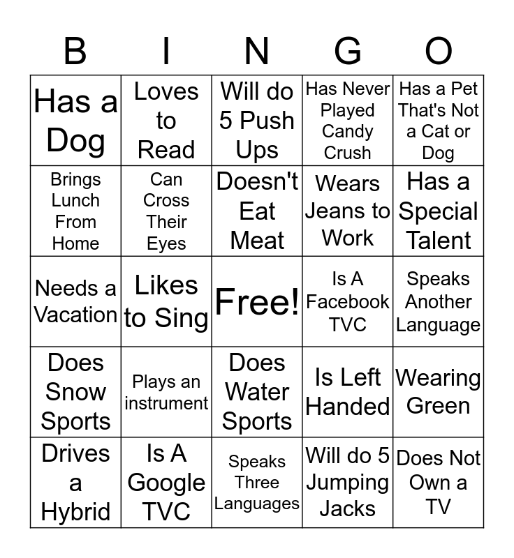 This bingo card has a free space and 29 words: Drives a Hybrid, Drives an Electric Car, Likes to Sing, Has a Cat, Has a Dog, Will do 5 Push Ups, Can Cross Their Eyes, Plays an instrument, Is A Facebook TVC, Is A Google TVC, Speaks Another Language, Does Not Own a TV, Speaks Three Languages, Will do 5 Jumping Jacks, Has a Special Talent, Has a Kid, Does Water Sports, Does Snow Sports, Has a Pet That's Not a Cat or Dog, Needs a Vacation, Is Left Handed, Is Right Handed, Wears Jeans to Work, Brings Lunch From Home, Has Never Played Candy Crush, Loves to Read, Wearing Green, Doesn't Eat Meat and Scared of Spiders.