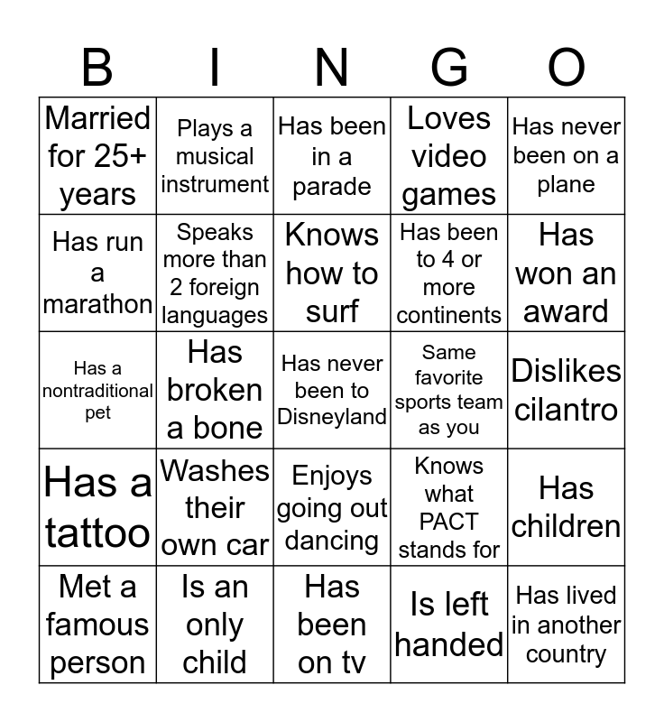 This bingo card has 25 words: Washes their own car, Has been on tv, Knows how to surf, Met a famous person, Has never been on a plane, Married for 25+ years, Has run a marathon, Plays a musical instrument, Same favorite sports team as you, Enjoys going out dancing, Has been to 4 or more continents, Has a nontraditional pet, Knows what PACT stands for, Has children, Speaks more than 2 foreign languages, Has lived in another country, Dislikes cilantro, Has been in a parade, Has won an award, Has broken a bone, Has never been to Disneyland, Is an only child, Has a tattoo, Loves video games and Is left handed.