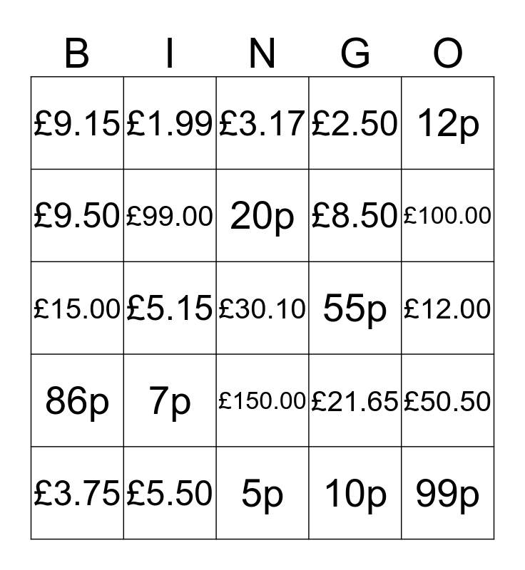 This bingo card has 25 words: 7p, 5p, 20p, £3.75, 12p, £9.15, £9.50, £1.99, 55p, £150.00, £8.50, £15.00, £21.65, £50.50, £99.00, 99p, £12.00, £3.17, £100.00, £5.15, £30.10, £5.50, 86p, £2.50 and 10p.