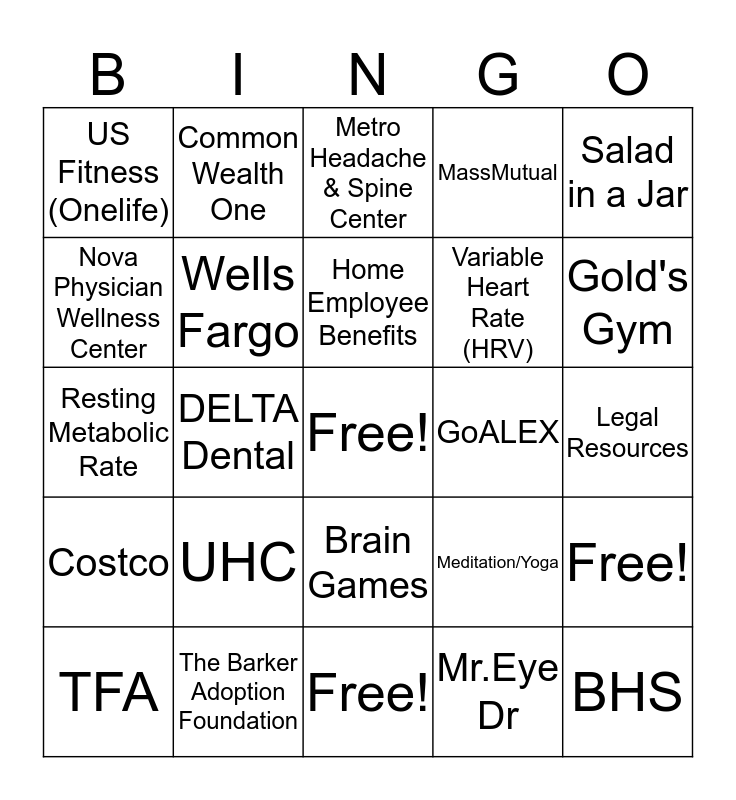 This bingo card has a free space and 24 words: UHC, The Barker Adoption Foundation, Home Employee Benefits, TFA, Salad in a Jar, US Fitness (Onelife), Nova Physician Wellness Center, Common Wealth One, GoALEX, Brain Games, Variable Heart Rate (HRV), Resting Metabolic Rate, Meditation/Yoga, Free!, Wells Fargo, Mr.Eye Dr, Legal Resources, Metro Headache & Spine Center, Gold's Gym, DELTA Dental, BHS, Costco, MassMutual and Free!.