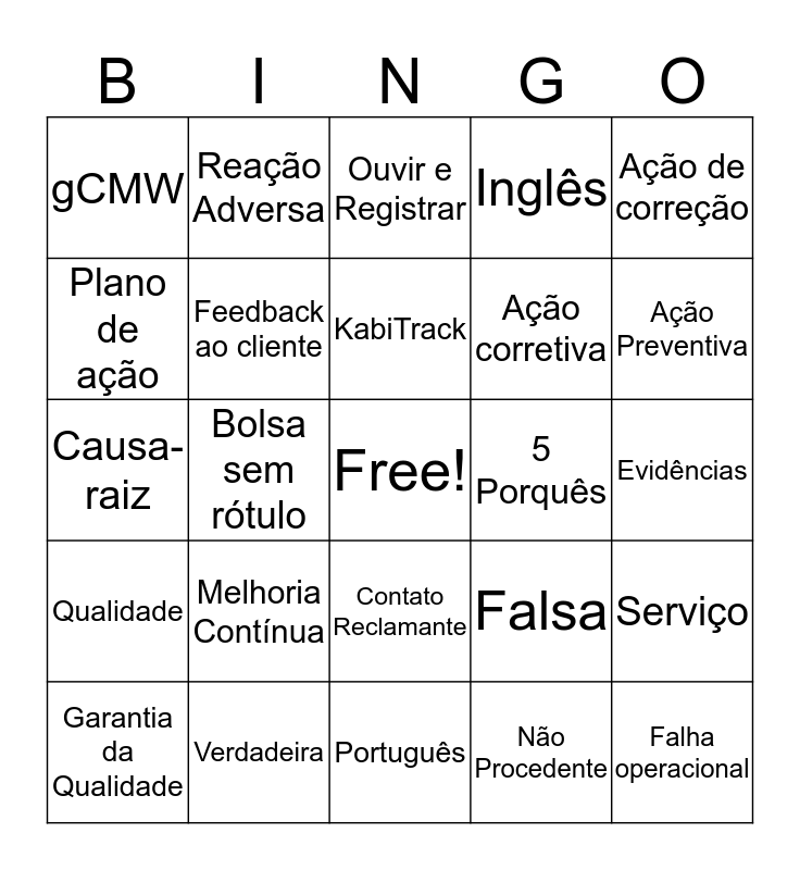 This bingo card has a free space and 24 words: Melhoria Contínua, Verdadeira, KabiTrack, Garantia da Qualidade, Ação de correção, gCMW, Plano de ação, Reação Adversa, 5 Porquês, Contato Reclamante, Ação corretiva, Causa-raiz, Falsa, Serviço, Feedback ao cliente, Não Procedente, Evidências, Ouvir e Registrar, Ação Preventiva, Bolsa sem rótulo, Falha operacional, Qualidade, Inglês and Português.