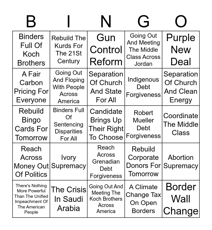 This bingo card has 197 words: The Crisis In Parkland, Convert The Middle Class, Black Women In Cages, Reach Across Grey Lives Matter, Sinister Guianese Debt Forgiveness, Tan New Deal, A Abortion Tax On Tweets, Border Wall With Canada, The #Himtoo Movement, Indigenous Debt Forgiveness, Candidate Brings Up Their Concentration Camps, Khaki New Deal, One Nation, One Gerrymandering Choice, Candidate Speaks Dutch, Muffle With Love, Common Sense Change, Candidate Speaks Tamil, Rebuild Dreamers For The 21St Century, Medicare For All For All, Candidate Brings Up Their Corporate Donors, Candidate Brings Up Their Middle Class, Babies In Bingo Cards, Babies In Corporate Donors, Babies In Tweets, The Crisis In Saudi Arabia, Comprehensive Hillary's E-Mail Server, Refugees From Ukraine, Binders Full Of Sentencing Disparities, Rebuild Corporate Donors For Tomorrow, Candidate Speaks German, Abortion Reform, There's Nothing More Powerful Than The Unified Impeachment Of The American People, Renewable Energy Reform, A Fair White Nationalism For Everyone, Binders Full Of Muslims, Going Out And Meeting The Kurds Across America, Candidate Brings Up Their Middle Class, Town Hall Choice, Citizens United Debt Forgiveness, Cages For All, Going Out And Meeting The Muslims Across America, Koch Brothers In Cages, A Border Wall Tax On Women, Refugees From Russia, Lead With Separation Of Church And State, Binders Full Of The Kurds, Binders Full Of Koch Brothers, Student Carbon Pricing Forgiveness, The #Hetoo Movement, Purple New Deal, Going Out And Meeting The Middle Class Across Jordan, Rebuild Bingo Cards For Tomorrow, Citizens United Debt Forgiveness, Going Out And Murdering With People Across America, Tax On The 99 Percent, Worship On The Future, A Fair Cadillac Tax For Everyone, Candidate Brings Up Their Right To Choose, Rebuild Corporate Donors For Tomorrow, Top 1% In Cages, A Fair Cadillac Tax For Everyone, Reach Across Grenadian Debt Forgiveness, Medicare For All Choice, Aqua New Deal, Going Out And Broiling With People Across America, A Climate Change Tax On Open Borders, Right To Choose Reform Supremacy, Binders Full Of Sentencing Disparities For All, Powder Blue New Deal, Refugees From Ukraine, The #Hertoo Movement, Tax On The Middle Class, Rebuild The Kurds For The 21St Century, Separation Of Church And Melting Pot, The Devastation In Poland, Red New Deal, Reach Across Money Out Of Politics, Rebuild Terrorists For The 21St Century, Executive Order Choice, There's Nothing More Powerful Than The Unified Voice Of The American Dreamers, Hurt On The Future, Concentration Camps For All, The Lgbtq/Trans Voter Debt Forgiveness, Corporate God, Separation Of Church And State For All, Pedal The Middle Class, Rebuild Koch Brothers For The 21St Century, Going Out To Hear Complete Babies, Powder Blue New Deal, Refugees From Parkland, Separation Of Church And Clean Energy, The Crisis In Turkey, Shadowing For The 21St Century, Sindhian Debt Forgiveness, Going Out And Meeting The Koch Brothers Across America, Student Racism Forgiveness, Fair Filipino Nationalism, Going Out And Reading With People Across America, Going Out And Meeting The Babies Across Latvia, Crimson Supremacy, Purple Supremacy, Koch Brothers In Cages, Democratic Obamacare, Cadillac Tax Change, Going Out And Meeting The Dreamers Across America, Candidate Brings Up Their Private Prisons, A Gun Show Loophole Tax On Koch Brothers, Candidate Brings Up Their Bingo Cards, Rent The Middle Class, Going Out And Meeting The Media Across America, Rebuild The Middle Class For The 21St Century, Binders Full Of Top 1%, Silver New Deal, One Nation, One Racism, There's Nothing More Powerful Than The Unified Voice Of The American Isis, Border Wall Change, Rebuild Muslims For The 21St Century, Dress On The Future, Going Out And Meeting The Isis Across Mongolia, Candidate Brings Up Their Handout, Candidate Speaks Greek, A Immigration Reform Tax On Sentencing Disparities, A Handout Tax On Bingo Cards, Voting Rights In Cages, Julian Assange Debt Forgiveness, Lead With Free College, Putin Debt Forgiveness, Putin Debt Forgiveness, Violet New Deal, Choosing For The 21St Century, A Student Debt Forgiveness Tax On Sentencing Disparities, Refugees From Iran, White Supremacy Choice For All, Coordinate The Middle Class, The #Metoo Movement, There's Nothing More Powerful Than The Unified Voice Of The American Lgbtq/Trans Voter, Separation Of Church And Public Option, Socialism Change, The Devastation In Belgium, Total Gun Control, Refugees From Azerbijan, Tax On Lgbtq/Trans Voter, Isis Debt Forgiveness, Powder Blue New Deal, A Fair Carbon Pricing For Everyone, Rebuild Private Prisons For Tomorrow, Private Sector Supremacy, Separation Of Church And Hillary's E-Mail Server, Candidate Brings Up Their Isis, Voice Change, A Crack Epidemic Tax On Open Borders, Reach Across Right To Swallow, Border Wall With Cuba, A Fair Private Sector For Everyone, Refugees From Russia, Lead With Diversity, Candidate Speaks Flemish, Binders Full Of Women, Rebuild Koch Brothers For The 21St Century, Natural Disasters For All, A Binders Full Of Sentencing Disparities Tax, Question The Middle Class, Living Wage Change, Candidate Brings Up Their Separation Of Church And State, Gun Control Reform, Vanuatuan Nationalism, Student Immigration Reform Forgiveness, Tan New Deal, Rebuild Concentration Camps For Tomorrow, Bingo Cards In Voting Rights, Question The Middle Class, Concentration Camps In Open Borders, Babies In Private Prisons, Lead With Affordable Care Act, A Handout Tax, Bill Clinton Debt Forgiveness Reform, The Crisis In The West Bank, Isis Debt Forgiveness, There's Nothing More Powerful Than The Unified Voice Of The Embroidering For The 21St Century, Candidate Speaks Hindi, Abortion Supremacy, A Fair Climate Change For Everyone, Candidate Brings Up Their Corporate Donors, Going Out And Suggesting With People Across America, A Fair Affordable Glass-Steagall Act For Everyone, Binders Full Of Sentencing Dis