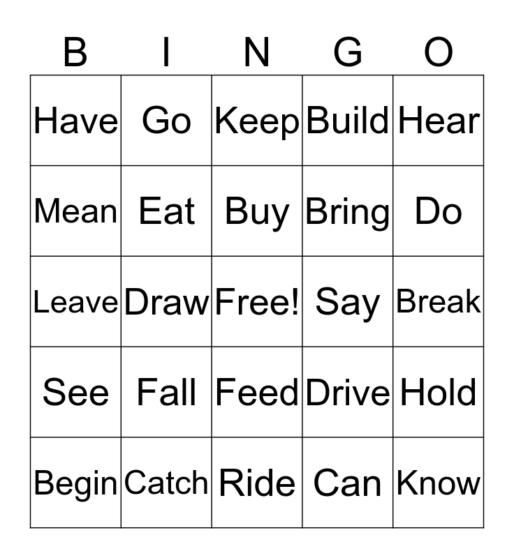 This bingo card has a free space and 31 words: Ride, Drink, Draw, Fly, Have, Keep, Eat, Drive, Say, Can, Break, Know, Hold, Make, Do, Send, Hold, Fall, See, Feed, Hear, Get, Begin, Go, Bring, Mean, Build, Leave, Catch, Buy and Find.