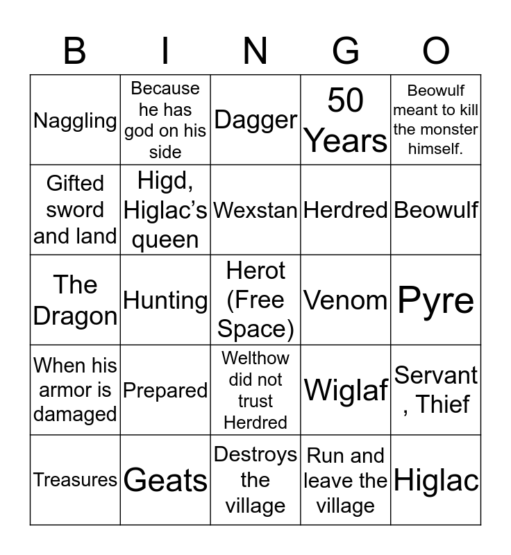This bingo card has a free space and 27 words: Wiglaf, Lead his people and build a statue Lead his people and build a statue, Herdred, Destroys the village, Gifted sword and land, Dagger, Because he has god on his side, When his armor is damaged, Venom, Servant , Thief, The Dragon, 50 Years, Treasures, Geats, Beowulf, Hrothgar, Higd, Higlac’s queen, Wexstan, Prepared, Naggling, Pyre, Run and leave the village, Hunting, Higlac, Welthow did not trust Herdred, Beowulf meant to kill the monster himself. and Burned.