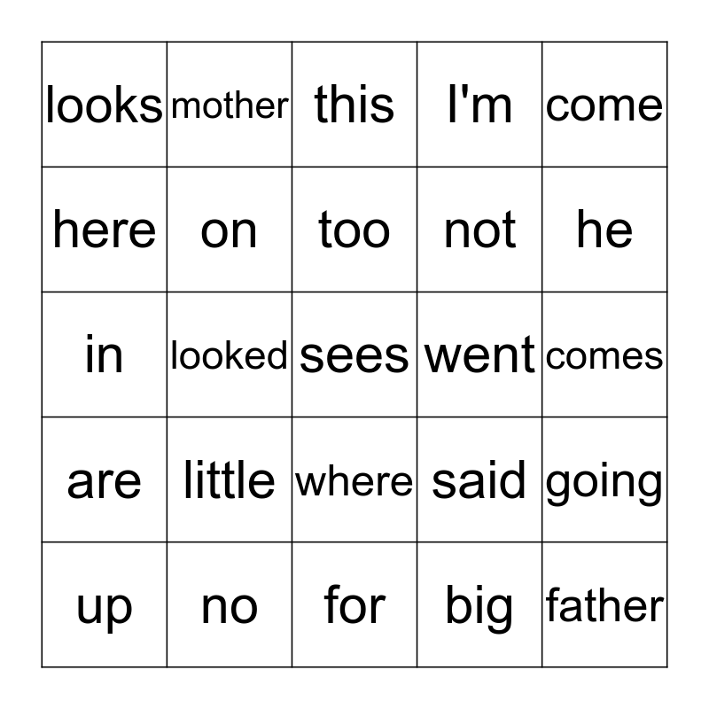 This bingo card has a free space and 24 words: little, no, too, up, come, looks, here, mother, went, where, not, in, said, going, on, big, comes, this, he, looked, father, are, I'm and for.