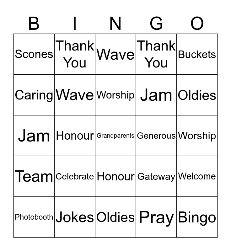 ⚠ This card has duplicate items: Bingo (2), Grandparents (2), Day (2), Oldies (2), Celebrate (2), Generations (2), Thank You (2), Cooking (2), Caring (2), Kids (2), Wave (2), Jokes (2), Welcome (2), Gateway (2), Church (2), Connect Card (2), Worship (2), Team (2), Buckets (2), Honour (2), Pray (2), Scones (2), Jam (2), Cream (2)