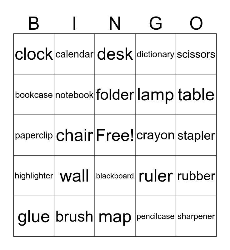 This bingo card has a free space and 24 words: wall, brush, folder, glue, scissors, clock, bookcase, calendar, crayon, blackboard, lamp, paperclip, ruler, rubber, notebook, pencilcase, stapler, desk, table, chair, sharpener, highlighter, dictionary and map.
