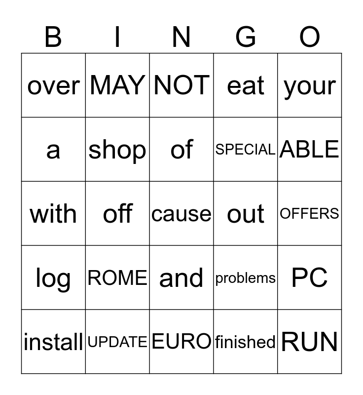 This bingo card has 35 words: go, to, the, shop, and, eat, a, bar, of, Chocolate, with, your, down, up, over, out, finished, off, log, cause, problems, install, PC, UPDATE, NOT, ABLE, RUN, FOR, SPECIAL, OFFERS, MILLION, EURO, ROME, MAY and DROGHEDA.