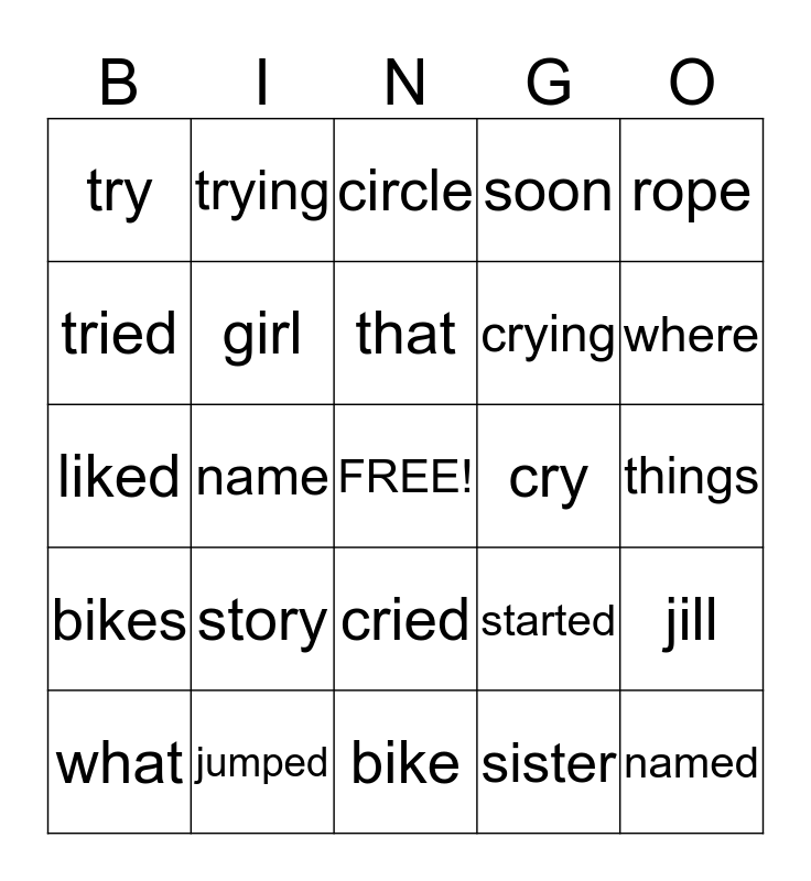 This bingo card has a free space and 24 words: story, jumped, that, what, rope, try, tried, trying, cry, cried, crying, liked, started, jill, girl, sister, things, circle, where, name, named, bikes, soon and bike.