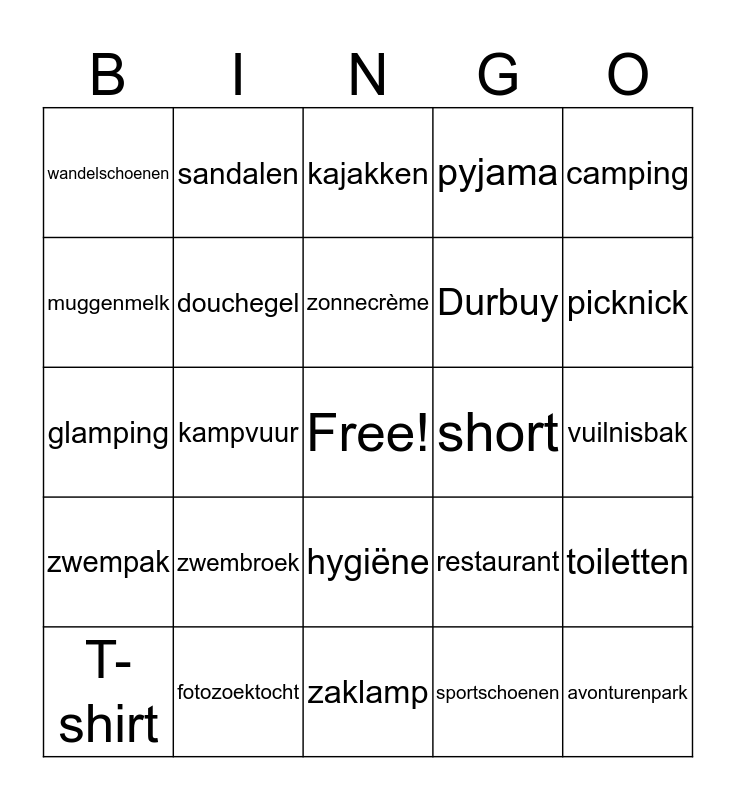 This bingo card has a free space and 25 words: zwembroek, zaklamp, zonnecrème, T-shirt, camping, wandelschoenen, muggenmelk, sandalen, short, hygiëne, Durbuy, glamping, restaurant, toiletten, douchegel, shampoo, vuilnisbak, kajakken, picknick, kampvuur, avonturenpark, fotozoektocht, zwempak, pyjama and sportschoenen.