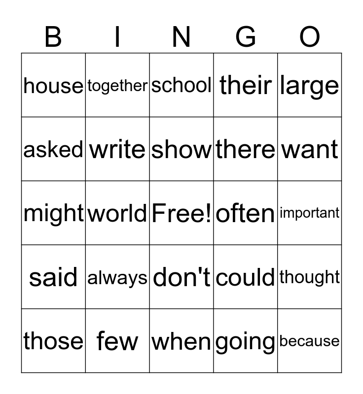 This bingo card has a free space and 24 words: always, few, show, those, large, house, asked, together, often, don't, there, might, could, thought, write, going, important, school, want, world, because, said, their and when.