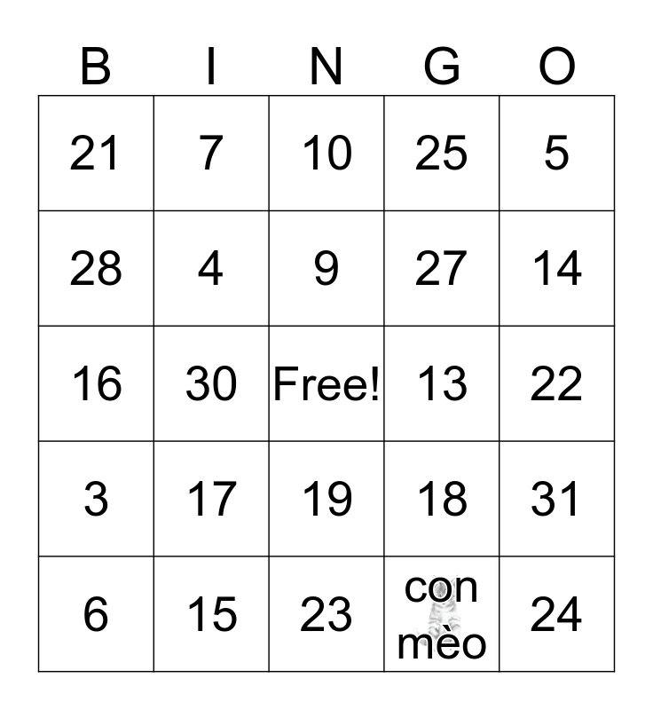 This bingo card has 2 images, a free space and 34 words: con chó, con mèo, 1, 2, 3, 4, 5, 6, 7, 8, 9, 10, 11, 12, 13, 14, 15, 16, 17, 18, 19, 20, 21, 22, 23, 24, 25, 26, 27, 28, 29, 30, 31 and 32.