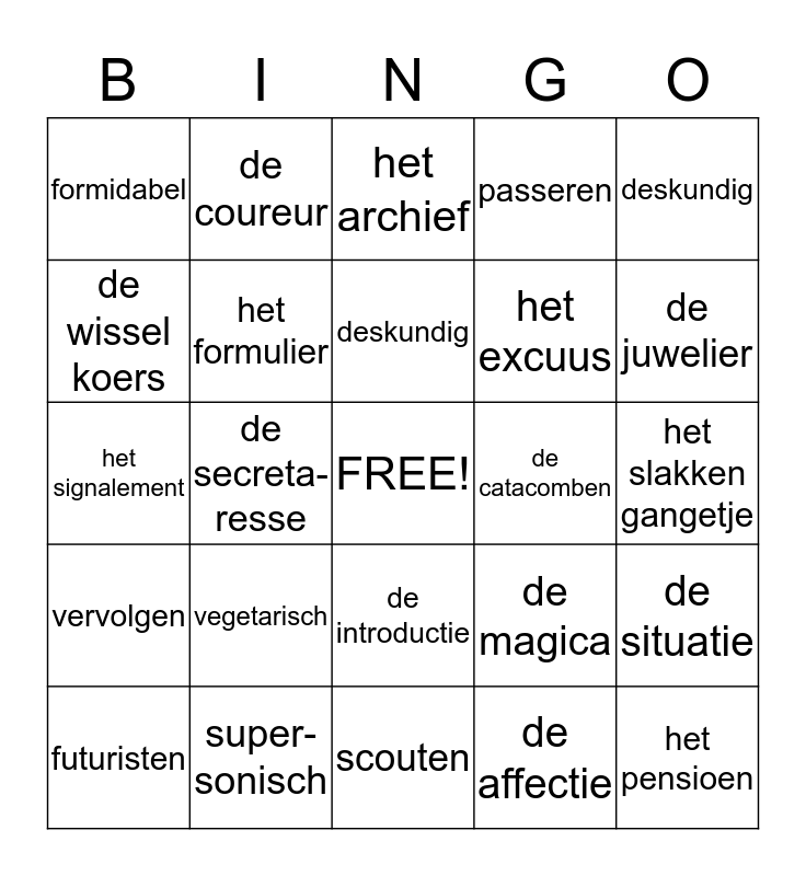 This bingo card has a free space and 24 words: vegetarisch, super- sonisch, deskundig, futuristen, deskundig, formidabel, de wissel koers, de coureur, de catacomben, de introductie, het excuus, het signalement, de magica, de situatie, het formulier, de affectie, het slakken gangetje, het archief, de juwelier, de secreta- resse, het pensioen, vervolgen, passeren and scouten.