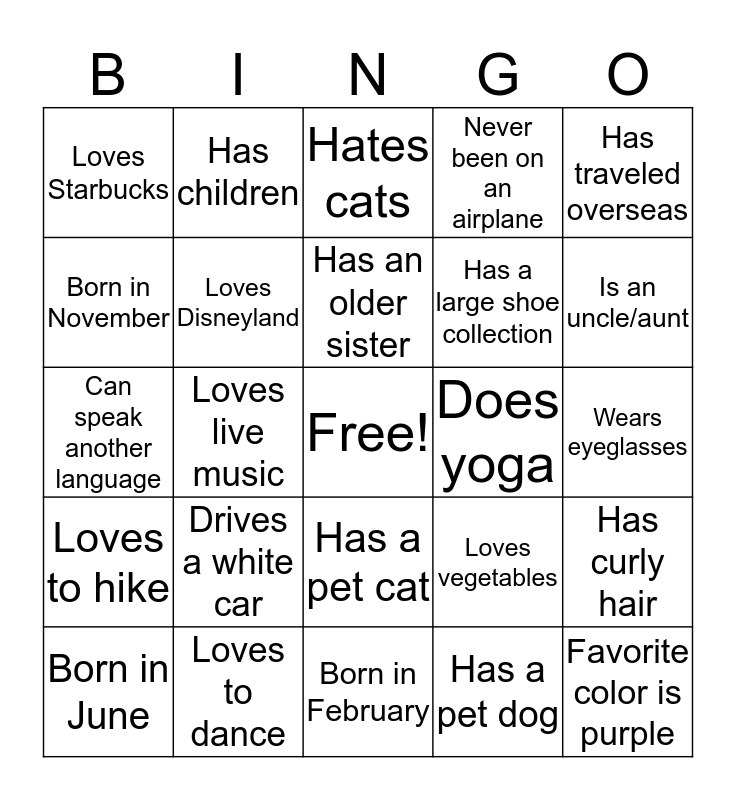 This bingo card has a free space and 24 words: Drives a white car, Loves to dance, Has an older sister, Born in June, Has traveled overseas, Loves Starbucks, Born in November, Has children, Does yoga, Has a pet cat, Has a large shoe collection, Can speak another language, Loves vegetables, Has curly hair, Loves Disneyland, Has a pet dog, Wears eyeglasses, Hates cats, Is an uncle/aunt, Loves live music, Favorite color is purple, Loves to hike, Never been on an airplane and Born in February.