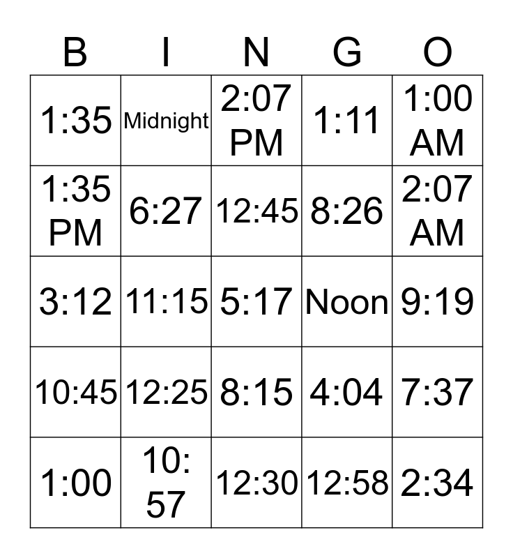 This bingo card has 25 words: 12:25, 12:30, 12:45, 1:00, 1:00 AM, 1:35, 1:35 PM, Midnight, Noon, 8:15, 8:26, 3:12, 4:04, 7:37, 6:27, 2:34, 9:19, 2:07 PM, 2:07 AM, 11:15, 5:17, 10: 57, 10:45, 1:11 and 12:58.