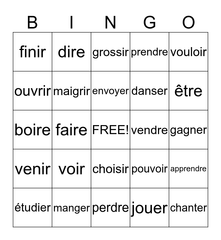This bingo card has a free space and 30 words: manger, aller, faire, dessiner, finir, grossir, maigrir, choisir, vendre, perdre, gagner, chanter, jouer, avoir, être, devoir, pouvoir, venir, voir, vouloir, boire, regarder, dire, danser, ouvrir, prendre, apprendre, étudier, envoyer and attendre.