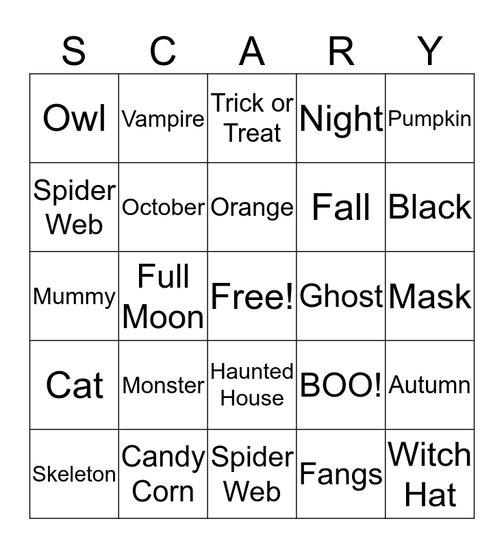 This bingo card has a free space and 33 words: Halloween, Broom, Full Moon, Witch, Cat, October, Pumpkin, Skeleton, Vampire, Bat, Orange, Trick or Treat, Costume, Candy, Ghost, Black, Candy Corn, Mummy, Monster, BOO!, Haunted House, Spider, Owl, Mask, Spider Web, Witch Hat, Night, Fall, Spider Web, Autumn, Night, Fangs and Zombie.