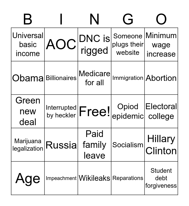 This bingo card has a free space and 24 words: Russia, Impeachment, Medicare for all, Age, Minimum wage increase, Universal basic income, Obama, AOC, Opiod epidemic, Paid family leave, Immigration, Green new deal, Socialism, Hillary Clinton, Billionaires, Reparations, Electoral college, DNC is rigged, Abortion, Interrupted by heckler, Student debt forgiveness, Marijuana legalization, Someone plugs their website and Wikileaks.