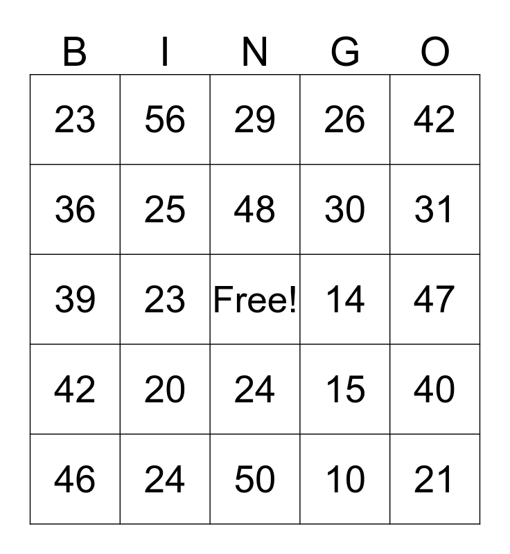 This bingo card has a free space and 24 words: 20, 24, 48, 46, 42, 23, 36, 56, 14, 24, 30, 39, 15, 40, 25, 10, 47, 29, 31, 23, 21, 42, 26 and 50.