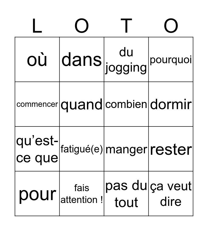 This bingo card has 34 words: beaucoup de fruits, bien, bouger, ça va, ça veut dire, combien, commencer, comment, dans, deux fois, dormir, du jogging, du sport, en forme, fais attention !, fatigué(e), malade, manger, marcher, même, nécessaire, nouveau, nouvelle, où, pas du tout, poser, pour, pourquoi, presque, qu’est-ce que, quand, qui, rester, souvent and tous les jours.